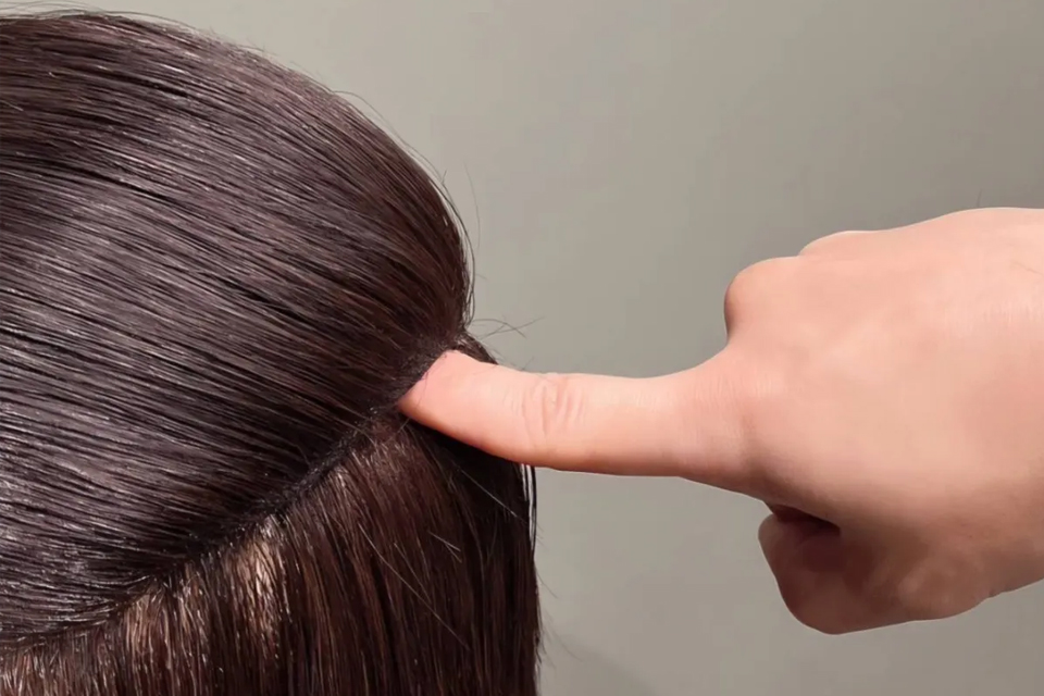 バンビーニーのウィッグは、自毛と結びつける特殊な構造(ジョイント)をしており、ネットの編み目から指を通して、直接頭皮に触れることができます。