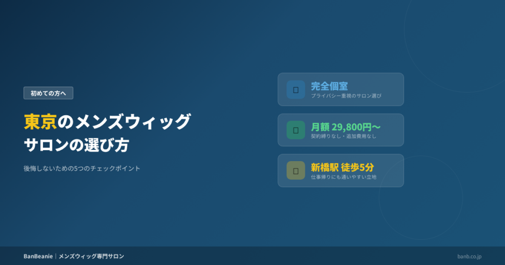 たとえばバンビーニー(BanBeanie)は、新橋・汐留イタリア街にある完全個室のメンズウィッグ専門サロンです。月額29,800円(税込 32,780円)の定額制で、契約期間の縛りがなく、いつでもやめられる仕組みを採用しています。